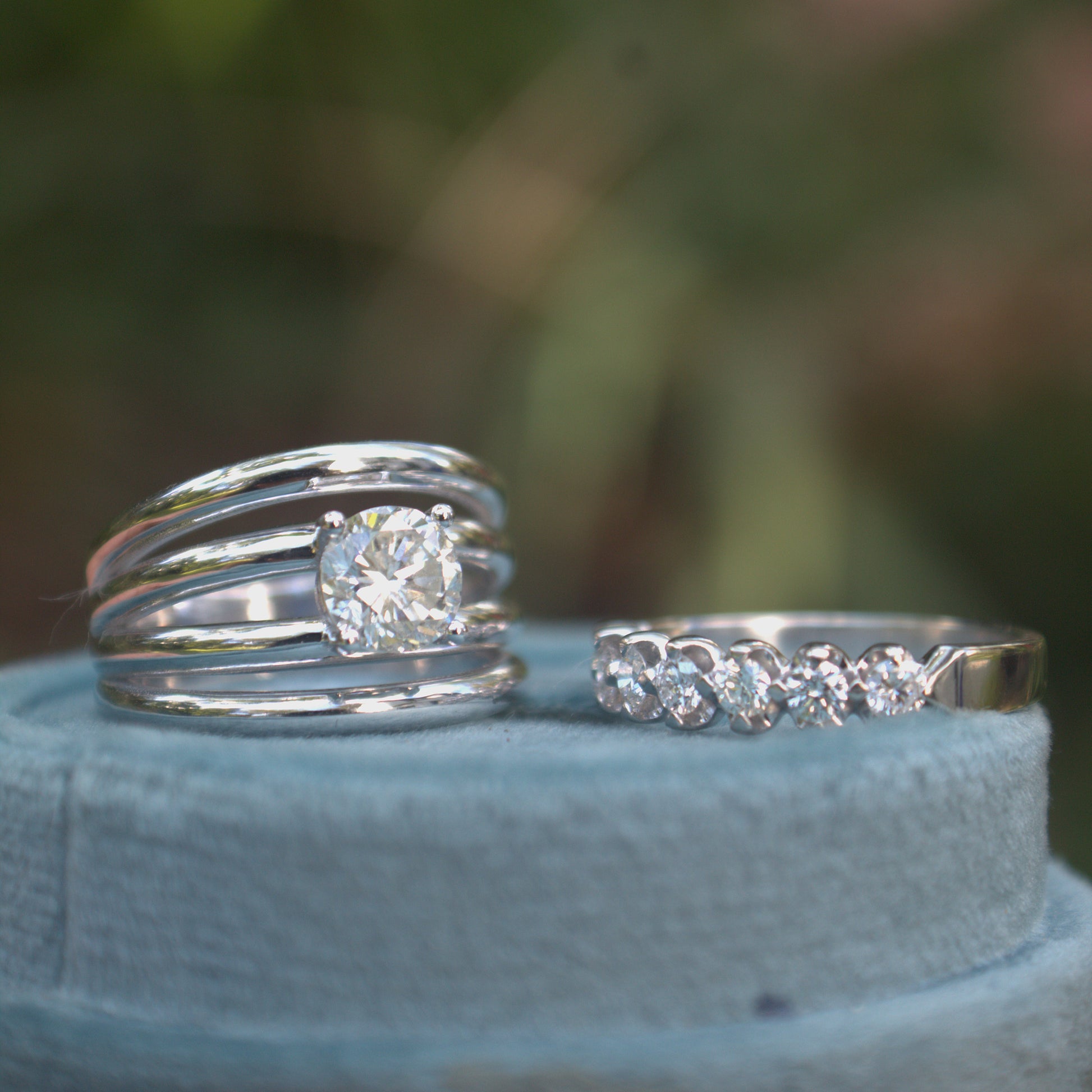remove anniversary band from wedding set, return unused diamonds, scrap credit old engagement ring mounting (1.6dwt 14K)